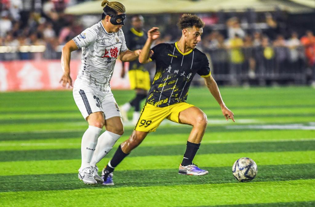 Italy's Segatto Marco (R), a player of Guizhou University international students football team, competes during a friendly football match in Rongjiang County of southwest China's Guizhou Province, April 13, 2024.(Xinhua/Tao Liang)