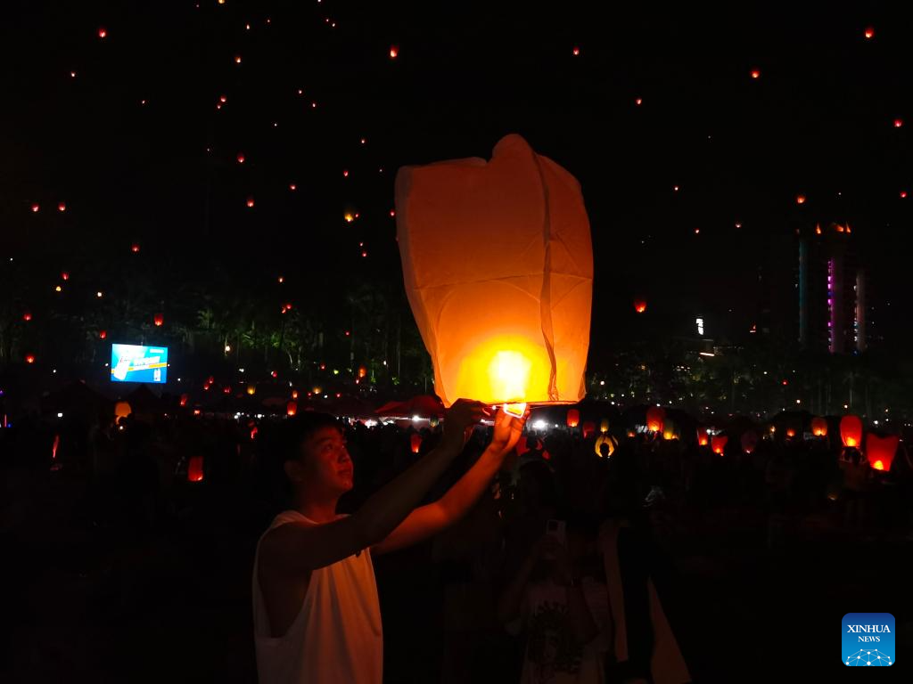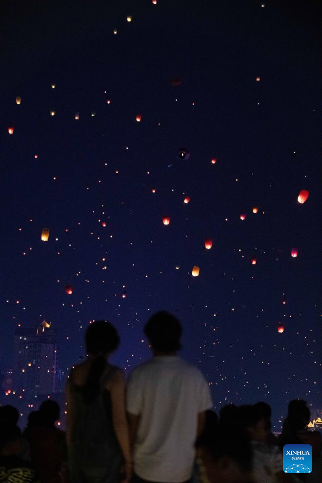 People fly Kongming lanterns, a kind of small hot-air paper balloon, by the Lancang River in Jinghong City, southwest China's Yunnan Province, April 13, 2024, to celebrate the New Year of the calendar of the Dai ethnic group. (Xinhua/Dong Bohuai)
