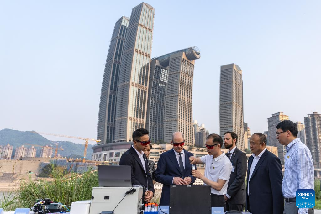 Federal Chancellor of Germany Olaf Scholz learns about a Sino-German cooperative scientific research project on water monitoring in Jiangbeizui, southwest China's Chongqing Municipality, April 14, 2024. Scholz arrived in Chongqing Municipality on Sunday to kick off his three-day official visit to China at the invitation of Chinese Premier Li Qiang. (Xinhua/Huang Wei)