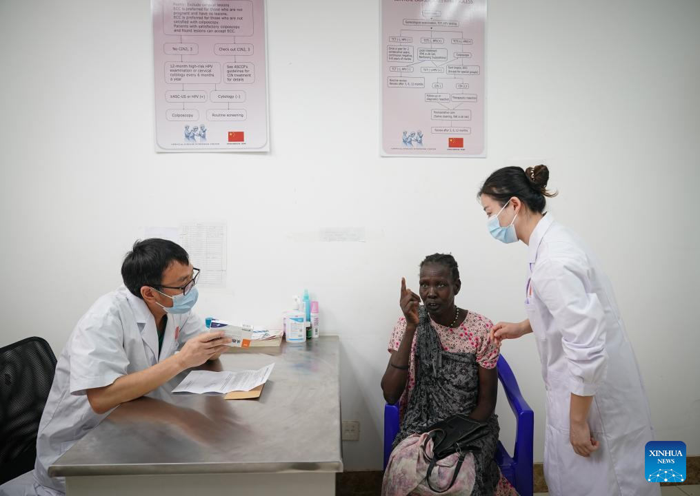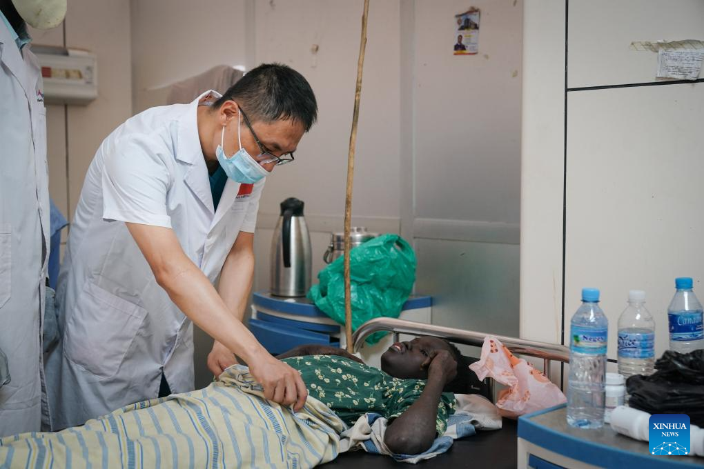 Chen Si, head of the 11th batch of Chinese medical team to South Sudan, attends to a patient at Juba Teaching Hospital in Juba, South Sudan, on April 11, 2024. The 11th batch of Chinese medical team to South Sudan has been providing medical services at the Juba Teaching Hospital since September 2023. As of early April, 2024, the medical team had provided 6,873 outpatient and emergency services, completed 82 surgeries, organized six free treatment event, and provided professional training for over 1,100 local medical personnel. (Xinhua/Han Xu)