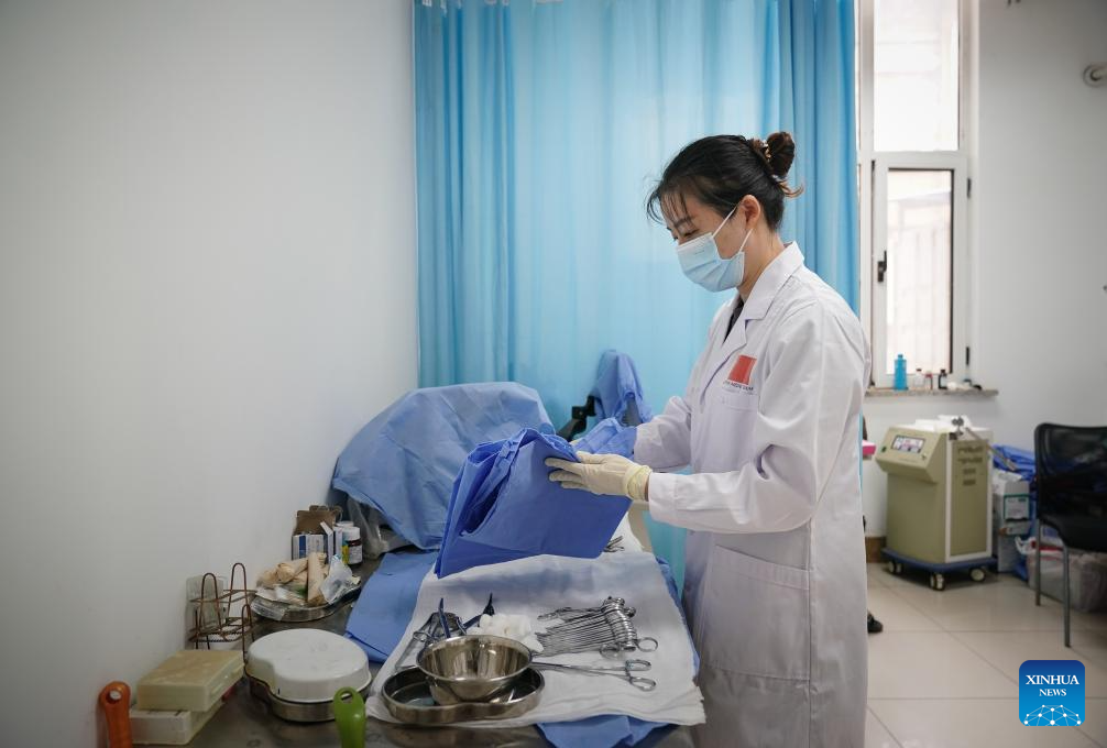 Wen Hui, a nurse from the 11th batch of Chinese medical team to South Sudan, arranges medical equipment at Juba Teaching Hospital in Juba, South Sudan, on April 11, 2024. The 11th batch of Chinese medical team to South Sudan has been providing medical services at the Juba Teaching Hospital since September 2023. As of early April, 2024, the medical team had provided 6,873 outpatient and emergency services, completed 82 surgeries, organized six free treatment event, and provided professional training for over 1,100 local medical personnel. (Xinhua/Han Xu)