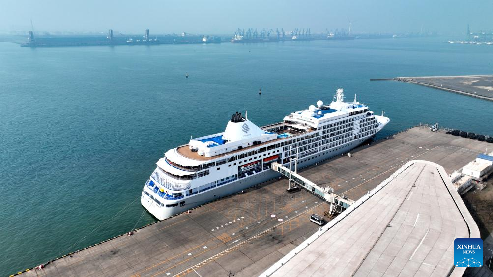 TIANJIN, April 13 (Xinhua) -- The Silver Shadow cruise ship, operated by the Royal Caribbean Group, docked at Tianjin International Cruise Home Port in north China's port city of Tianjin on Saturday morning, making it the third international cruise ship to visit Tianjin within a week.