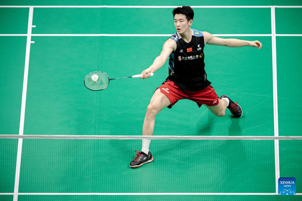 Li Shifeng of China hits a return during the men's singles semifinal between Li Shifeng of China and Naraoka Kodai of Japan at Asia Championships 2024 badminton tournament in Ningbo, east China's Zhejiang Province, April 13, 2024. (Xinhua/Jiang Han)