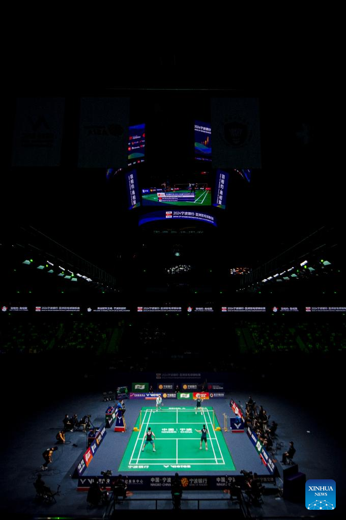 The photo taken on April 13, 2024 shows the general view before the women's doubles semifinal between Liu Shengshu/Tan Ning of China and Baek Ha Na/Lee So Hee of South Korea at Asia Championships 2024 badminton tournament in Ningbo, east China's Zhejiang Province. (Xinhua/Jiang Han)