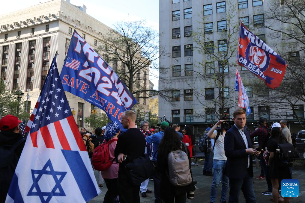 Former U.S. President Donald Trump's supporters show up at Collect Pond Park in front of the building of New York County Criminal Court in New York, the United States, on April 15, 2024. Former U.S. President Donald Trump on Monday appeared in a criminal court in Manhattan, New York City, in the hush money case, making him the first former U.S. president to stand a criminal trial. (Xinhua/Liu Yanan)