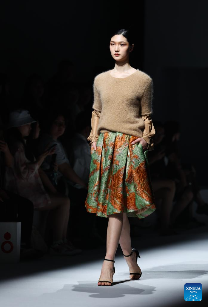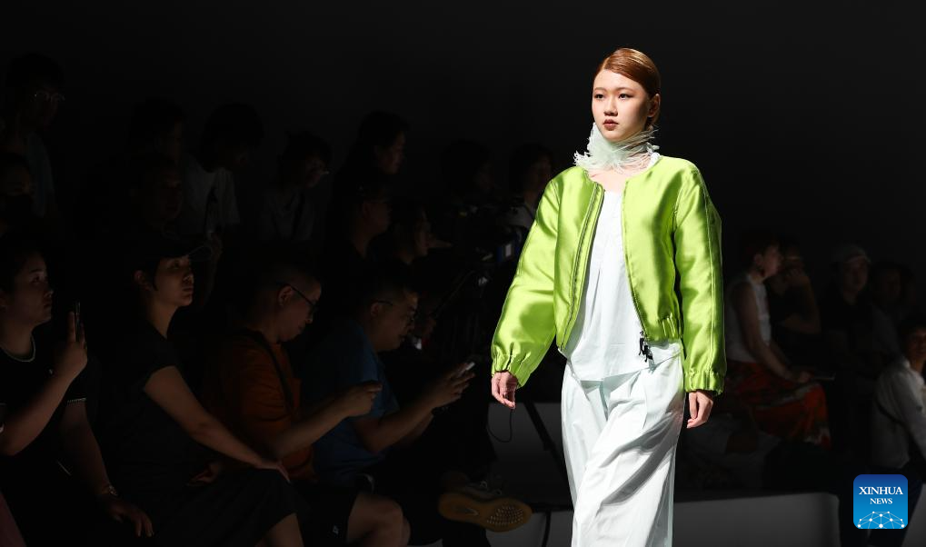 A model presents a creation during a fashion show at the fourth China International Consumer Products Expo (CICPE) in Haikou, capital city of south China's Hainan Province, April 15, 2024. The Expo, which started Saturday and lasts till April 18, is China's only national-level exhibition featuring consumer products and also the largest consumer expo in the Asia-Pacific region. (Xinhua/Yang Guanyu)