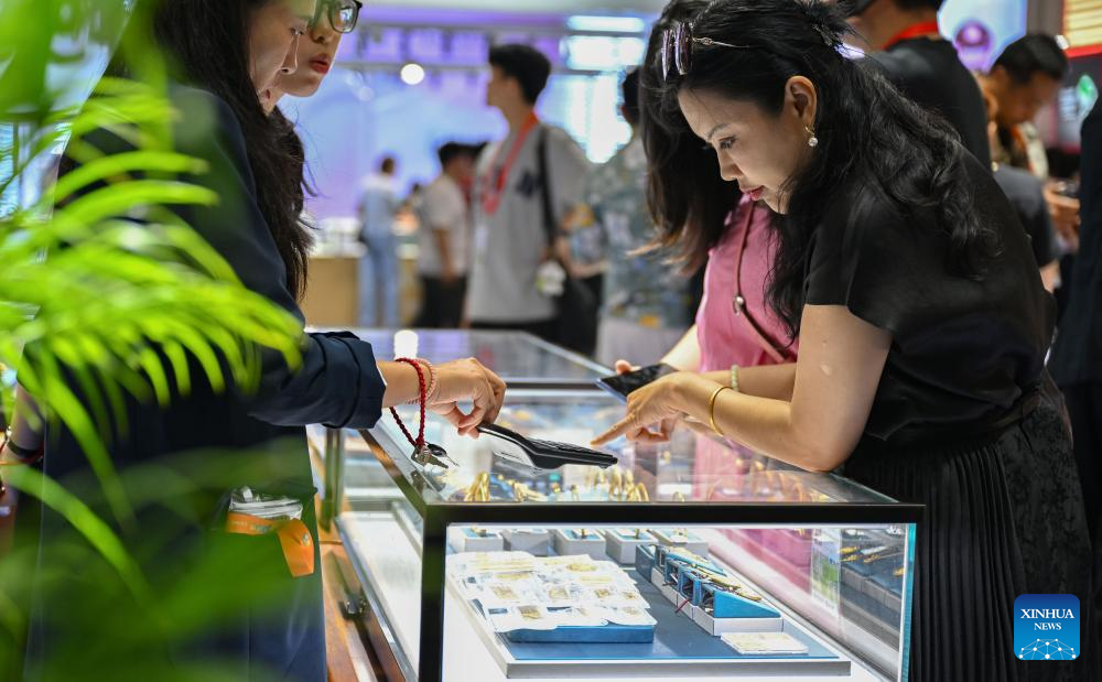 Visitors select jewelry at the fourth China International Consumer Products Expo (CICPE) in Haikou, capital city of south China's Hainan Province, April 15, 2024. The Expo, which started Saturday and lasts till April 18, is China's only national-level exhibition featuring consumer products and also the largest consumer expo in the Asia-Pacific region. (Xinhua/Li Mengjiao)