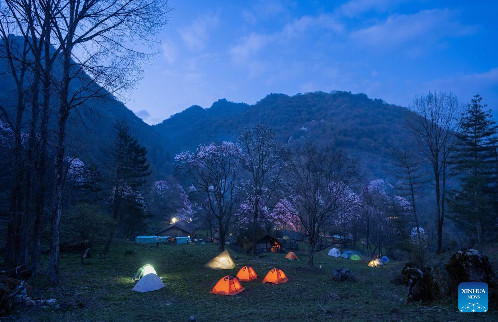 Tourists' tents are pictured under blooming magnolia flowers in Cangwangzhai Village of Yongsheng Town in Jiangyou, southwest China's Sichuan Province, April 13, 2024. (Xinhua/Jiang Hongjing)