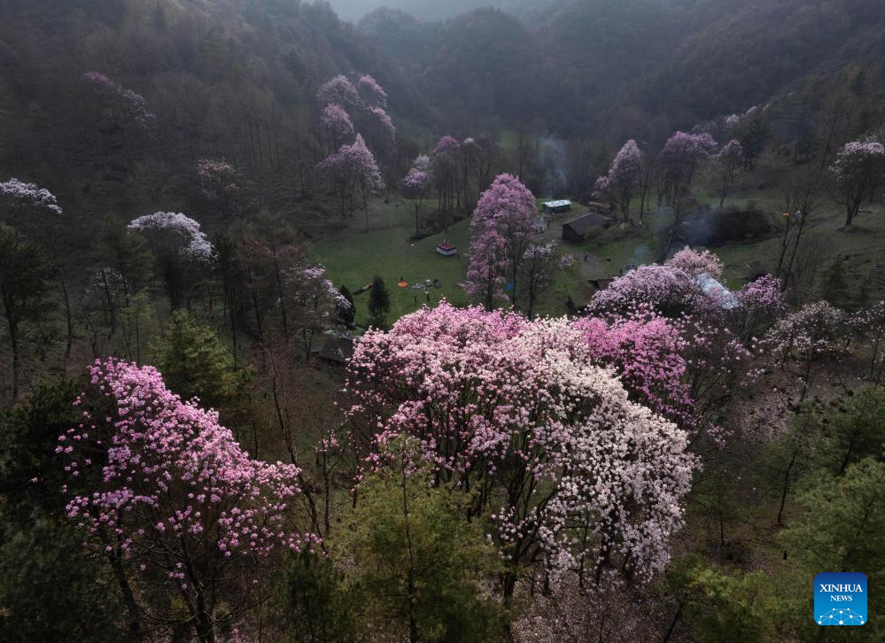 An aerial drone photo taken on April 14, 2024 shows blooming magnolia flowers in Cangwangzhai Village of Yongsheng Town in Jiangyou, southwest China's Sichuan Province. (Xinhua/Jiang Hongjing)