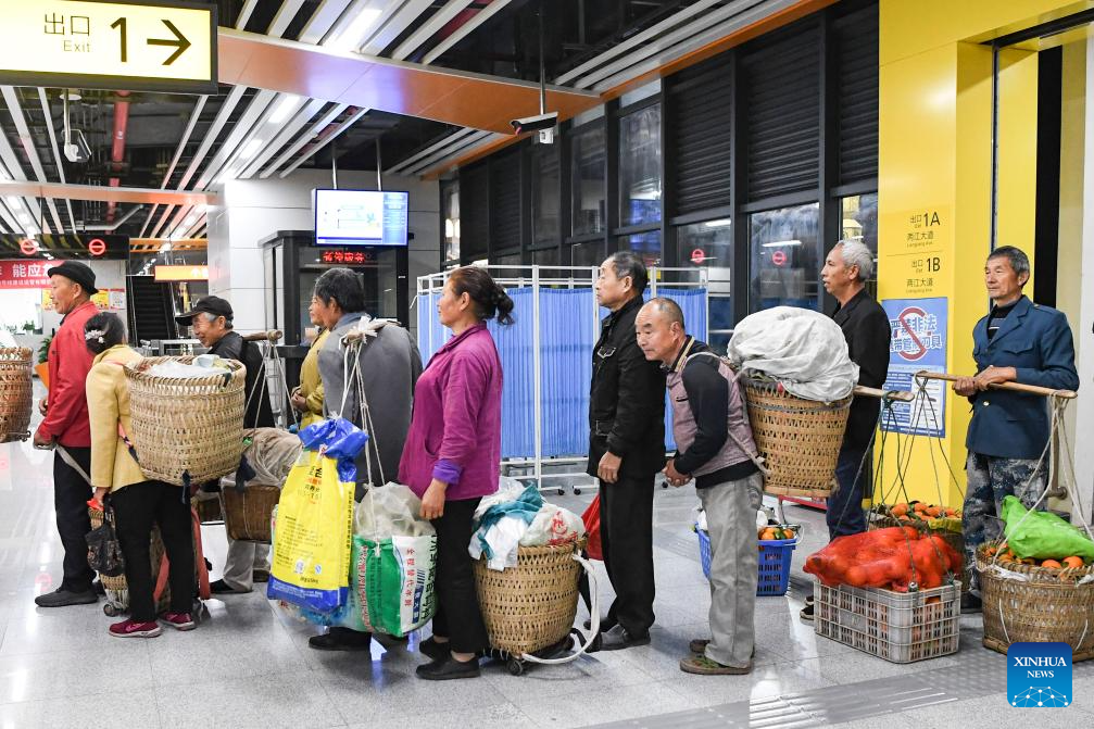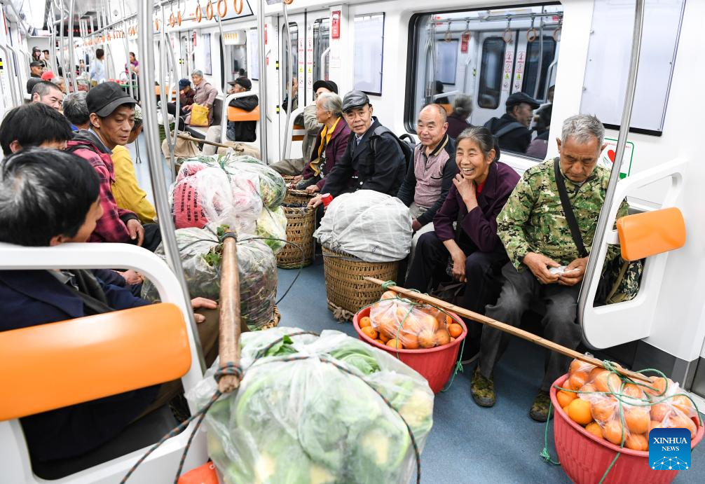 CHONGQING, April 16 (Xinhua) -- Since it was opened to traffic in June 2022, the Rail Transit Line 4 of southwest China's Chongqing Municipality has undertaken a different mission from its counterparts. Its first passengers every day are a bevy of villagers from its departure station, who come all the way to sell their home-grown vegetables to the urbanites.
