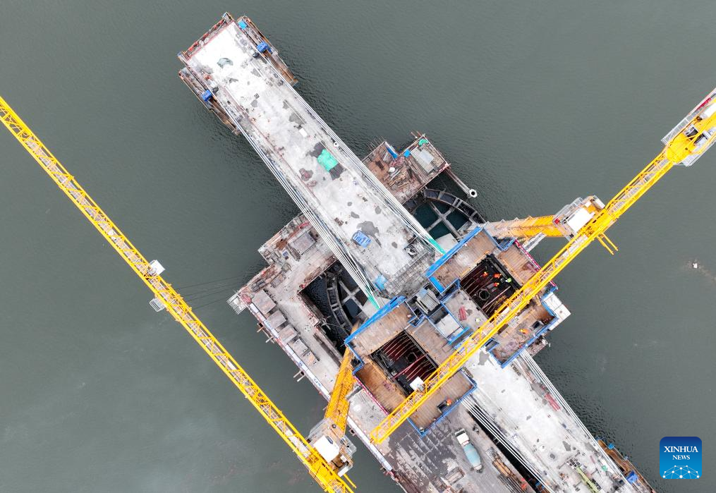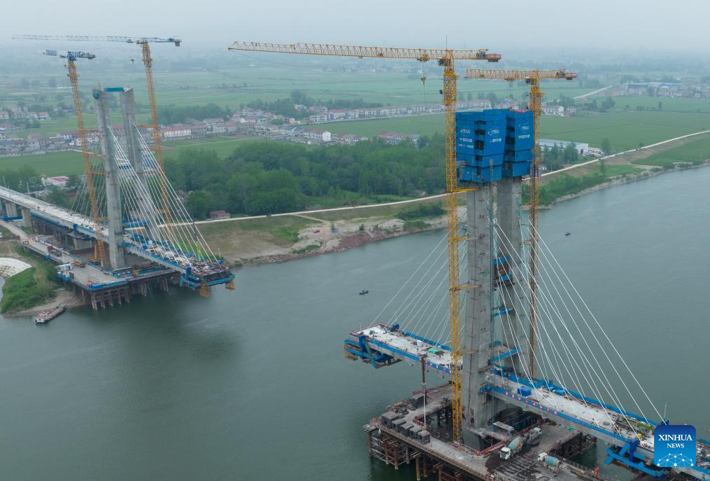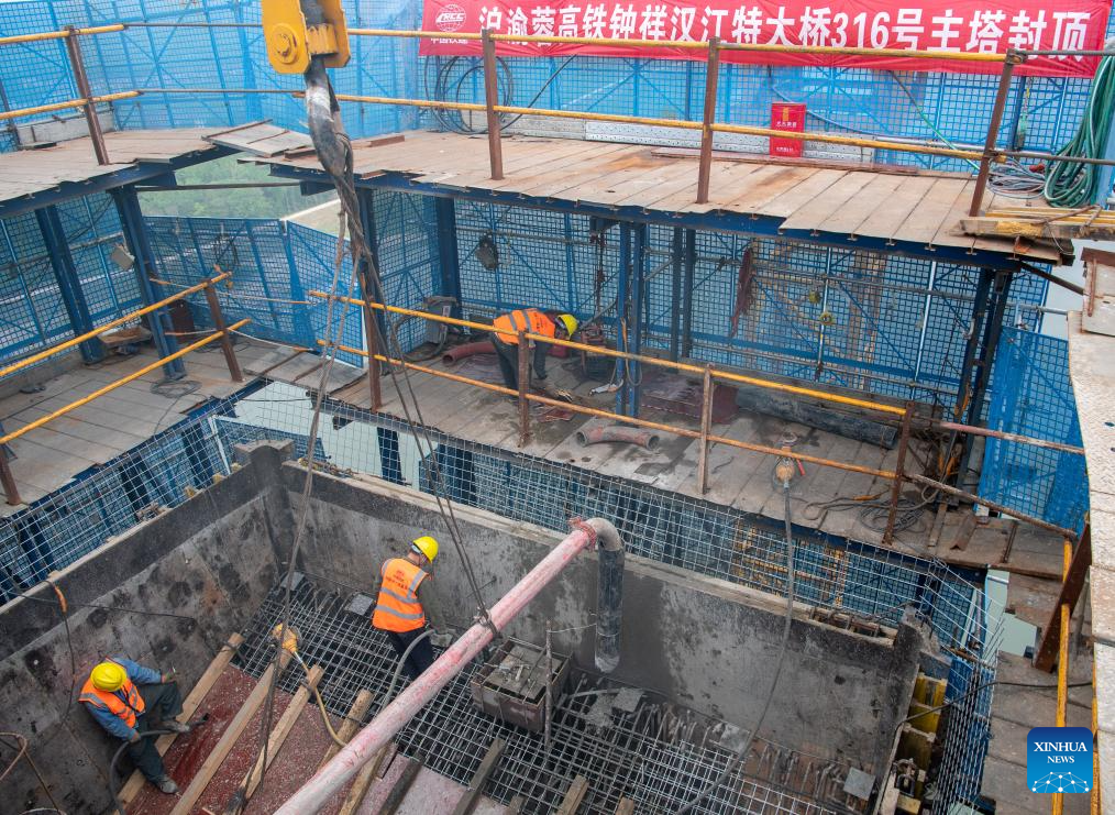 Laborers work at the construction site of Zhongxiang Hanjiang grand bridge in Jingmen, central China's Hubei Province, April 16, 2024. The No. 316 main tower of Zhongxiang Hanjiang grand bridge was successfully capped on Tuesday. The grand bridge is a key project of the Wuhan-Yichang section of a high-speed railway linking east China's Shanghai, southwest China's Chongqing and Chengdu of southwest China's Sichuan Province. (Xinhua/Du Zixuan)