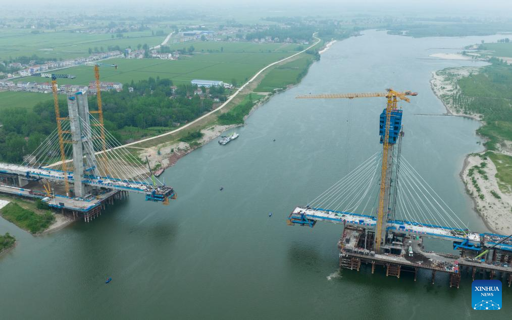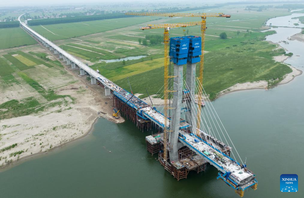 An aerial drone photo taken on April 16, 2024 shows the construction site of Zhongxiang Hanjiang grand bridge in Jingmen, central China's Hubei Province. The No. 316 main tower of Zhongxiang Hanjiang grand bridge was successfully capped on Tuesday. The grand bridge is a key project of the Wuhan-Yichang section of a high-speed railway linking east China's Shanghai, southwest China's Chongqing and Chengdu of southwest China's Sichuan Province. (Xinhua/Du Zixuan)