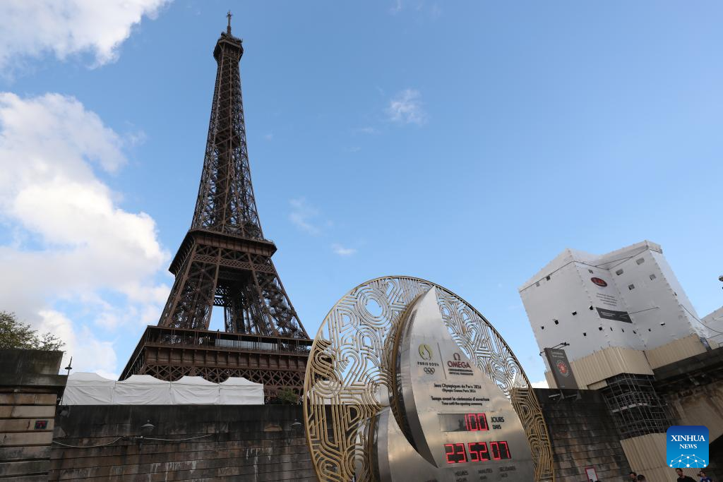 This photo taken on April 16, 2024 shows a countdown clock for the Paris 2024 Olympic Games in front of the Eiffel Tower in Paris, France. (Xinhua/Gao Jing)