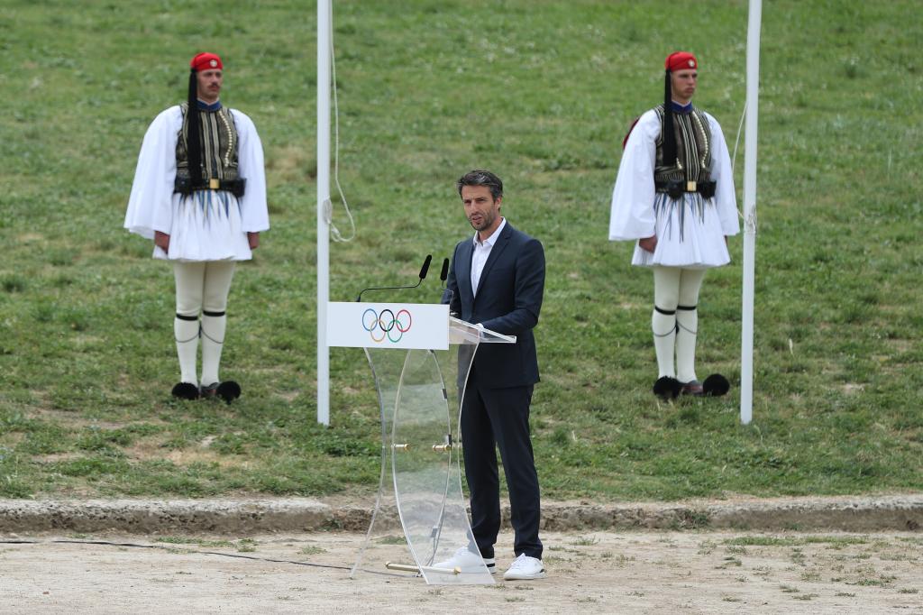 President of the Paris 2024 Organizing Committee Tony Estanguet delivers a speech during the Olympic flame lighting ceremony for the Paris 2024 Summer Olympic Games in Ancient Olympia, Greece, on April 16, 2024. (Xinhua/Zhao Dingzhe)
