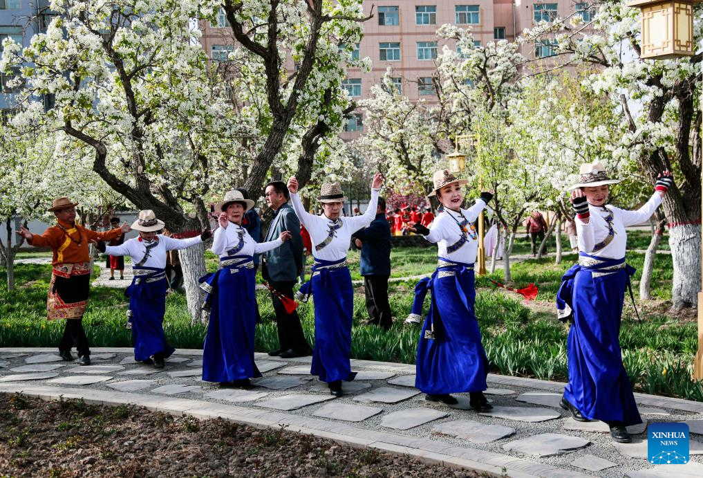 People perform Guozhuang dance, a traditional Tibetan dance, in Ganzhou District of Zhangye, northwest China's Gansu Province, April 17, 2024. (Photo by Chen Li/Xinhua)