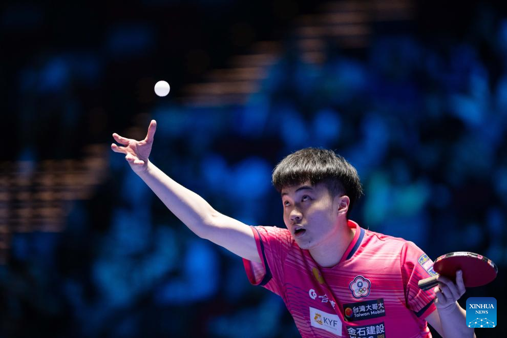 Lin Yun-ju of Chinese Taipei hits a return during the men's singles match against Matsushima Sora of Japan at the ITTF World Cup Macao 2024 at Galaxy Arena in Macao, China, April 17, 2024. (Xinhua/Cheong Kam Ka)