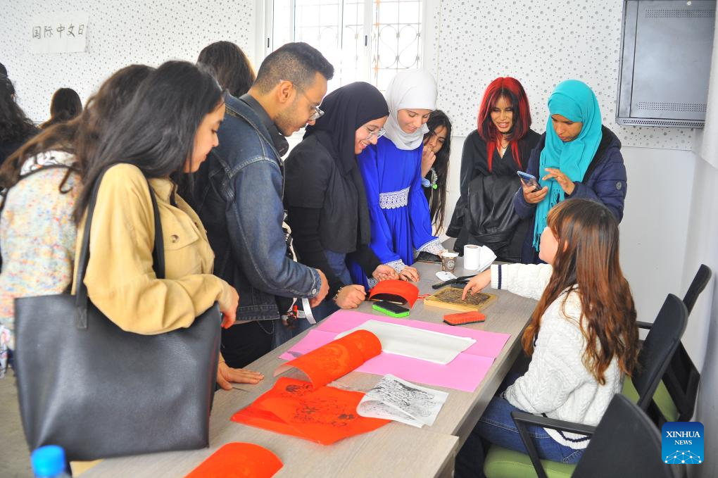 Students learn inscription rubbing in the Confucius Institute at Carthage University in Tunis, Tunisia, on April 17, 2024. Tunisia on Wednesday celebrated this year's United Nations Chinese Language Day, which falls on April 20, by holding a cultural event here in the capital city. (Photo by Adel Ezzine/Xinhua)