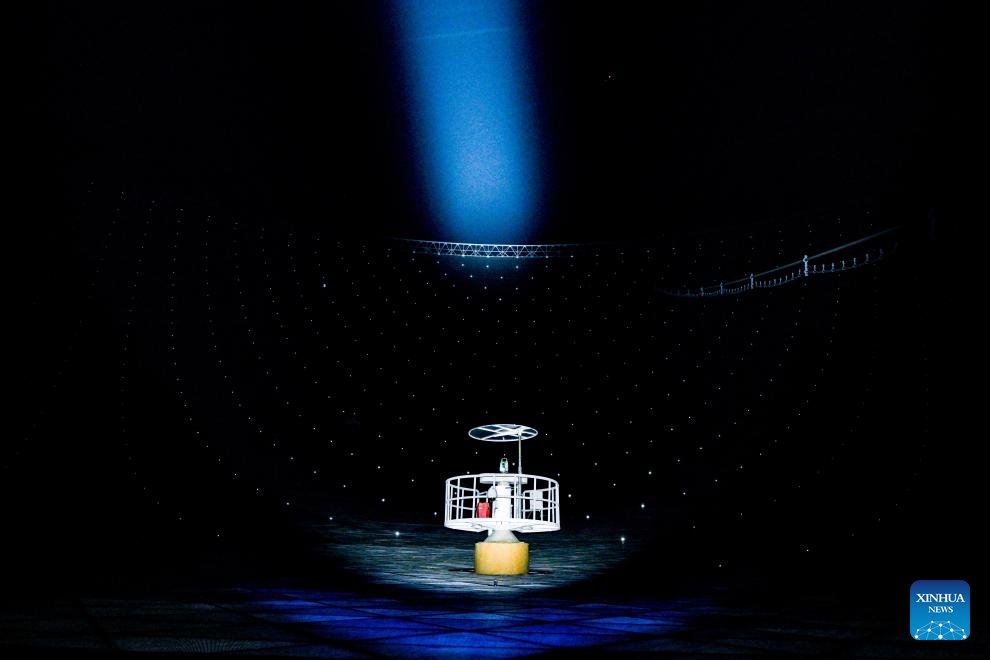 This photo taken on Feb. 26, 2024 with physical filter shows the feed cabin of China's Five-hundred-meter Aperture Spherical Radio Telescope (FAST) under maintenance in southwest China's Guizhou Province. China's Five-hundred-meter Aperture Spherical Radio Telescope (FAST), the world's largest single-dish radio telescope, has identified more than 900 new pulsars since its launch in 2016, its operator said Wednesday. (Xinhua/Ou Dongqu)