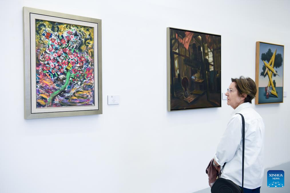 A woman views art works during the Chinese contemporary art exhibition "Fluyendo naturalmente" at China Cultural Center in Madrid, Spain, April 16, 2024. (Photo by Gustavo Valiente/Xinhua)