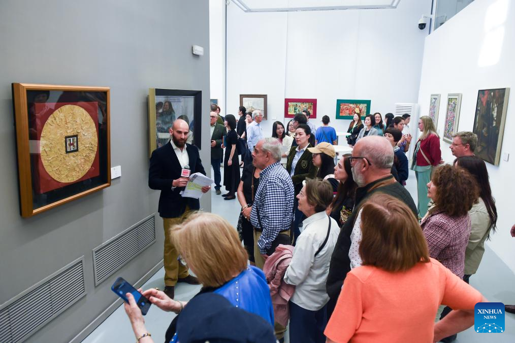People view art works during the Chinese contemporary art exhibition "Fluyendo naturalmente" at China Cultural Center in Madrid, Spain, April 16, 2024. (Photo by Gustavo Valiente/Xinhua)