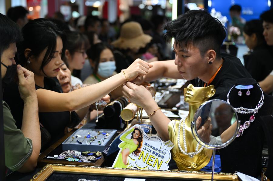 People select accessories at the fourth China International Consumer Products Expo (CICPE) in Haikou, capital city of south China's Hainan Province, April 18, 2024. (Xinhua/Guo Cheng)