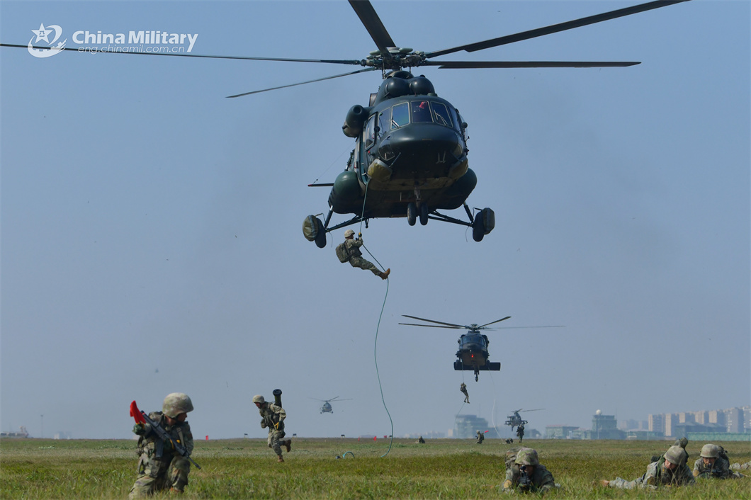 Fully-armed soldiers assigned to a brigade of the PLA 73rd Group Army successively fast-rope from a helicopter during a coordination training exercise with an army aviation unit in mid-March, 2024. (eng.chinamil.com.cn/Photo by Zhu Wanfu)