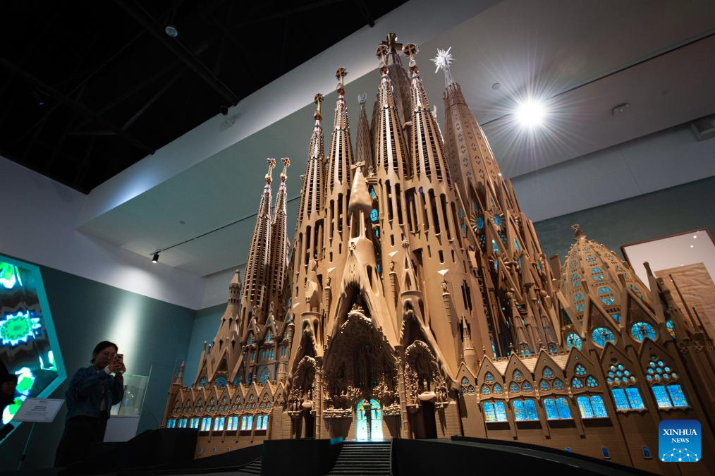 A visitor takes photos of an exhibit at an exhibition titled "Gaudi: Moment is Eternity" in Wuhan, central China's Hubei Province, April 18, 2024. Opened here on Thursday, the exhibition will last until October 20. (Xinhua/Hu Jingwen)