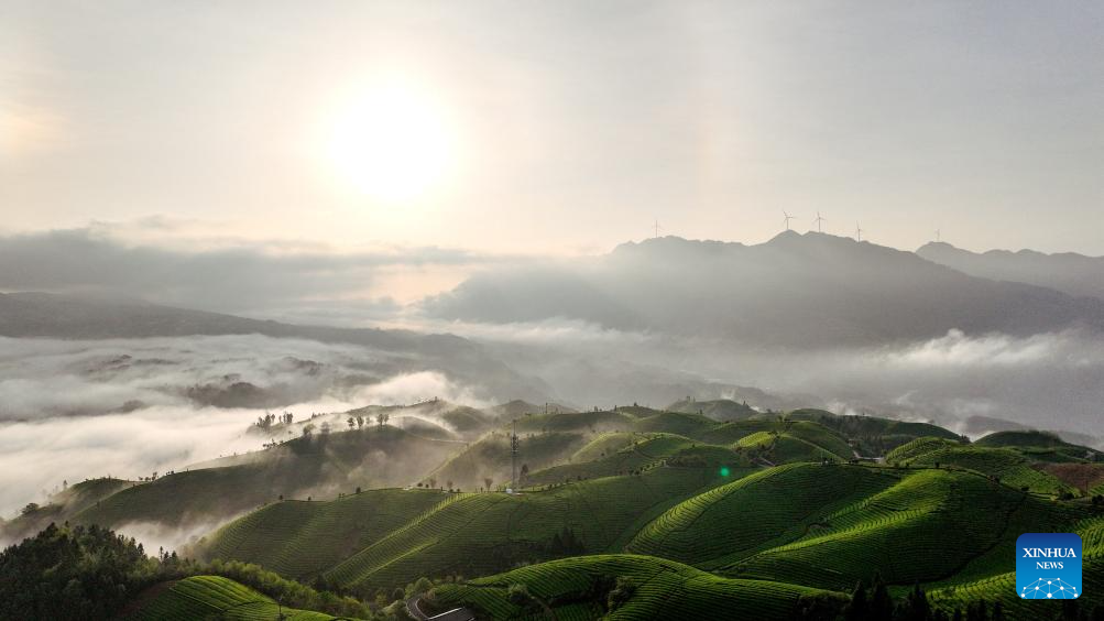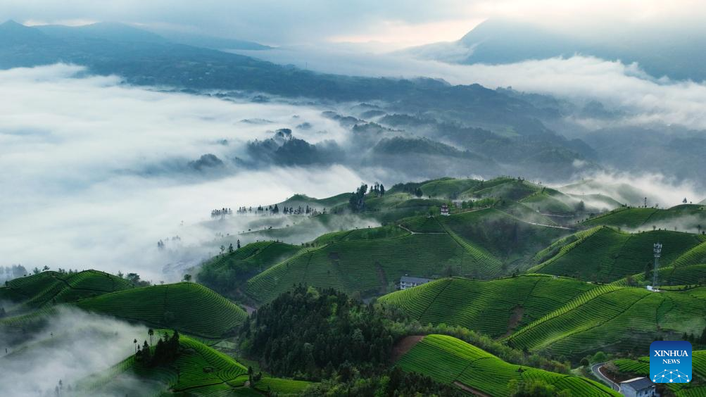 An aerial drone photo taken on April 18, 2024 shows the view of tea gardens in Zouma Town of Hefeng County, central China's Hubei Province. The county of Hefeng has made efforts in the coordinated development of tea planting and tourism industries to boost rural revitalization. (Photo by Chen Mingbin/Xinhua)