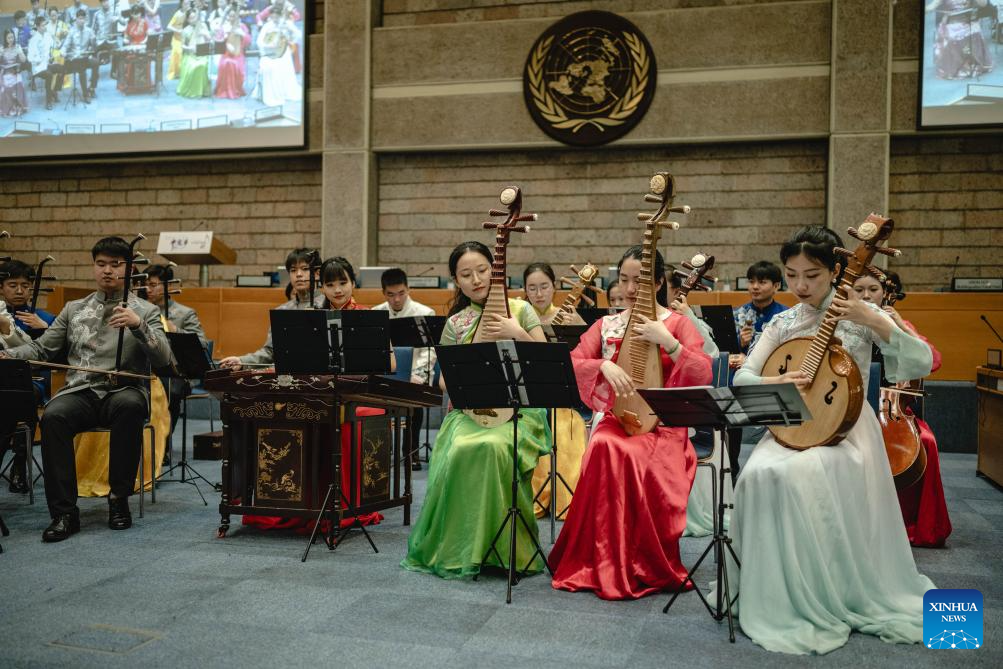 Members of an instrument orchestra of east China's Nanjing University perform during a UN Chinese Language Day event in Nairobi, Kenya, April 19, 2024. The United Nations Office in Nairobi (UNON) and the Chinese Embassy in Kenya celebrated UN Chinese Language Day on Friday with a vibrant event which included calligraphy, lectures and a musical performance. The ceremony featured traditional music from the instrument orchestra of east China's Nanjing University and was attended by senior UN officials, diplomats, students and faculty members from local universities. (Xinhua/Wang Guansen)