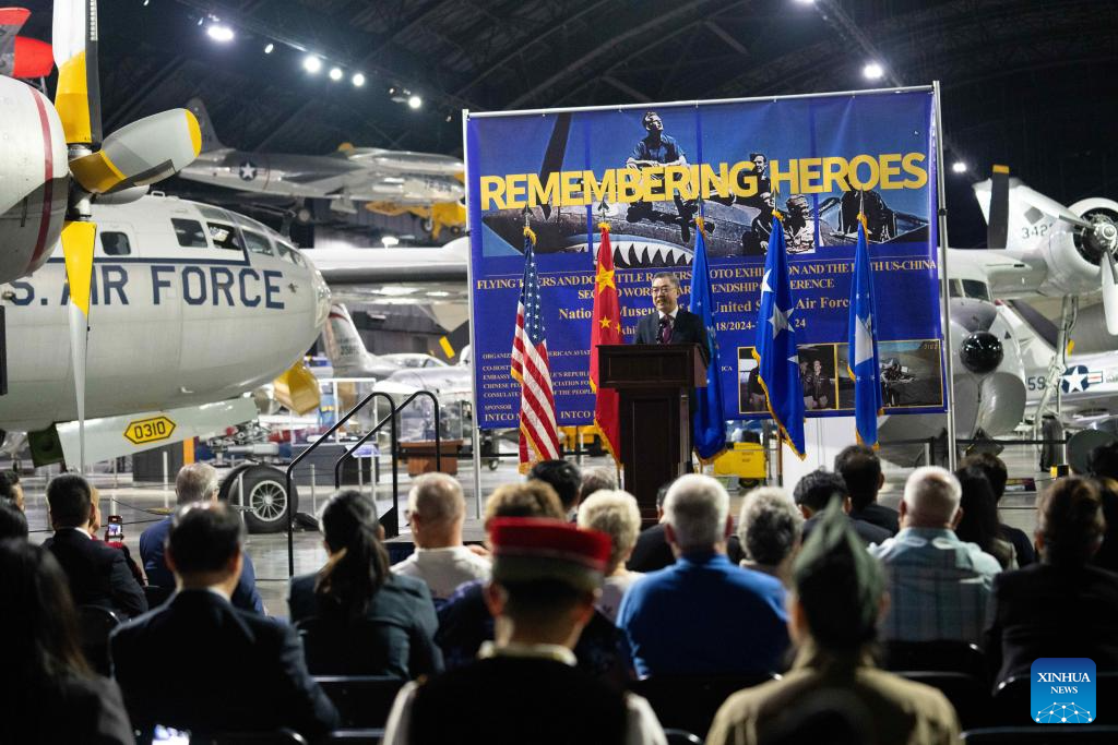 The Chinese Consul General in New York Huang Ping speaks during a photo exhibition commemorating the Flying Tigers and Doolittle Raiders, Americans who fought Japan in World War II in cooperation with the Chinese people, at the National Museum of the U.S. Air Force in Dayton, Ohio, the United States, April 18, 2024. The half-year-long exhibition recounts the stories of the Flying Tigers and Doolittle Raiders with around 100 photos and detailed narrations. (Xinhua/Liu Jie)
