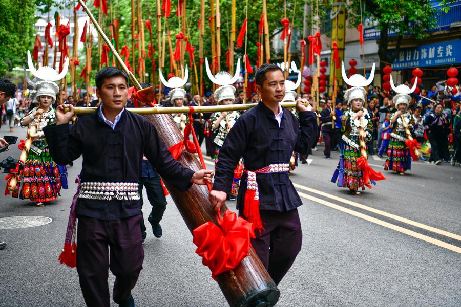 People of Miao ethnic group attend a parade to celebrate the Miao Sisters Festival in Taijiang County, southwest China's Guizhou Province, April 21, 2024. (Xinhua/Yang Wenbin)