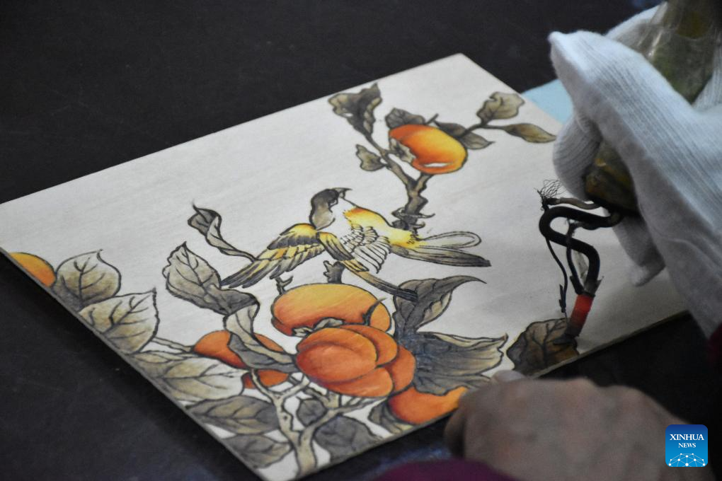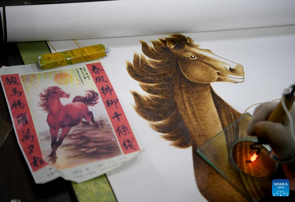 A lover of Nanyang pyrography makes an artwork of pyrography at a studio of Nanyang Pyrography Factory in Nanyang City, central China's Henan Province, March 14, 2024. (Xinhua/Gao Songling)