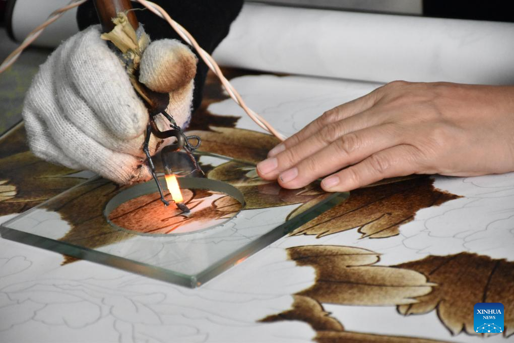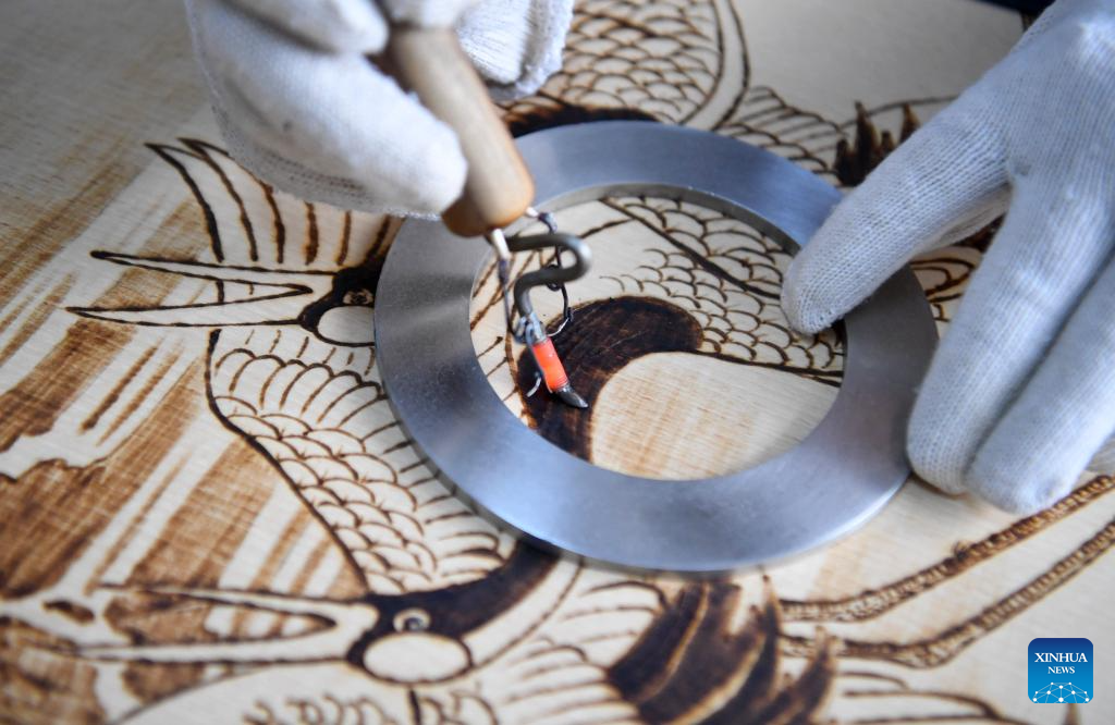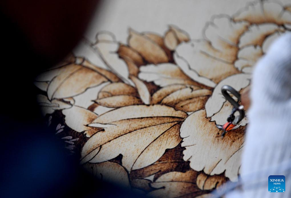 A lover of Nanyang pyrography makes an artwork of pyrography at a training class of Nanyang Pyrography Factory in Nanyang City, central China's Henan Province, March 14, 2024. (Xinhua/Hao Yuan)