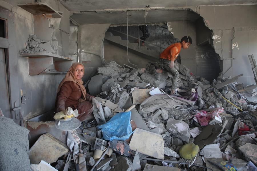 People are seen among the rubble of a destroyed building in the southern Gaza Strip city of Rafah, on April 20, 2024. (Photo by Khaled Omar/Xinhua)