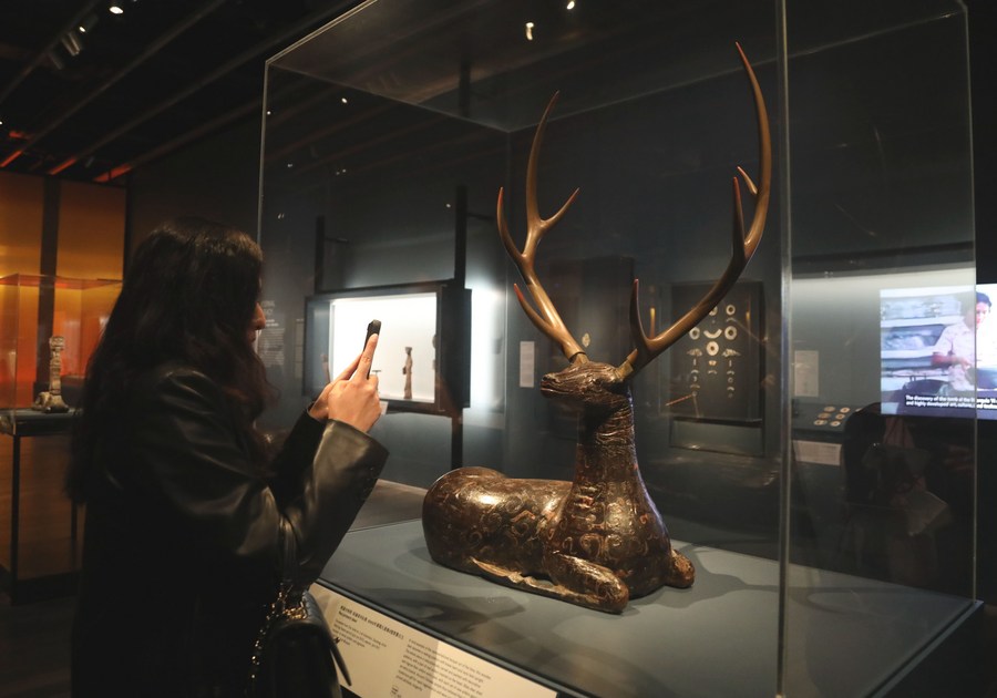 A visitor views an exhibit at a major exhibition of Chinese cultural relics from China's Bronze Age in San Francisco, California, the United States, April 19, 2024.(Xinhua/Wu Xiaoling)
