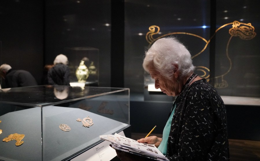 A visitor views an exhibit at a major exhibition of Chinese cultural relics from China's Bronze Age in San Francisco, California, the United States, April 19, 2024.(Photo by Liu Yilin/Xinhua)