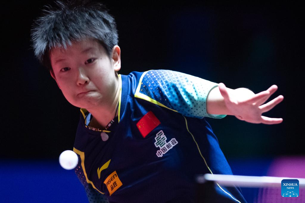 Sun Yingsha competes during the women's singles semifinal match between Sun Yingsha of China and her teammate Chen Meng at the ITTF World Cup Macao 2024 at Galaxy Arena in Macao, south China, April 20, 2024. (Xinhua/Cheong Kam Ka)