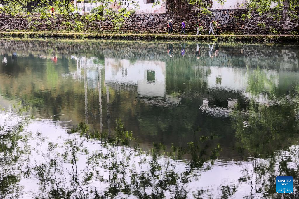 Tourists walk along the waterfront at Zhongcun Village of Luting Township, Yuyao City, east China's Zhejiang Province, April 13, 2024. (Xinhua/Lan Hongguang)