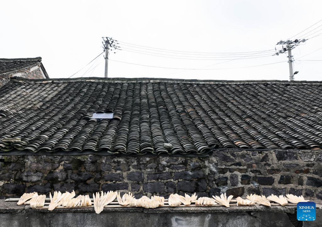 Bamboo shoots are aired in front of an old house at Bailu Village of Luting Township, Yuyao City, east China's Zhejiang Province, April 13, 2024. (Xinhua/Lan Hongguang)?