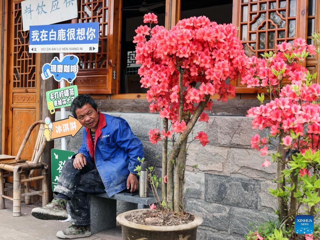 A villager takes a rest in front of a homestay at Bailu Village of Luting Township, Yuyao City, east China's Zhejiang Province, April 13, 2024. (Xinhua/Lan Hongguang)