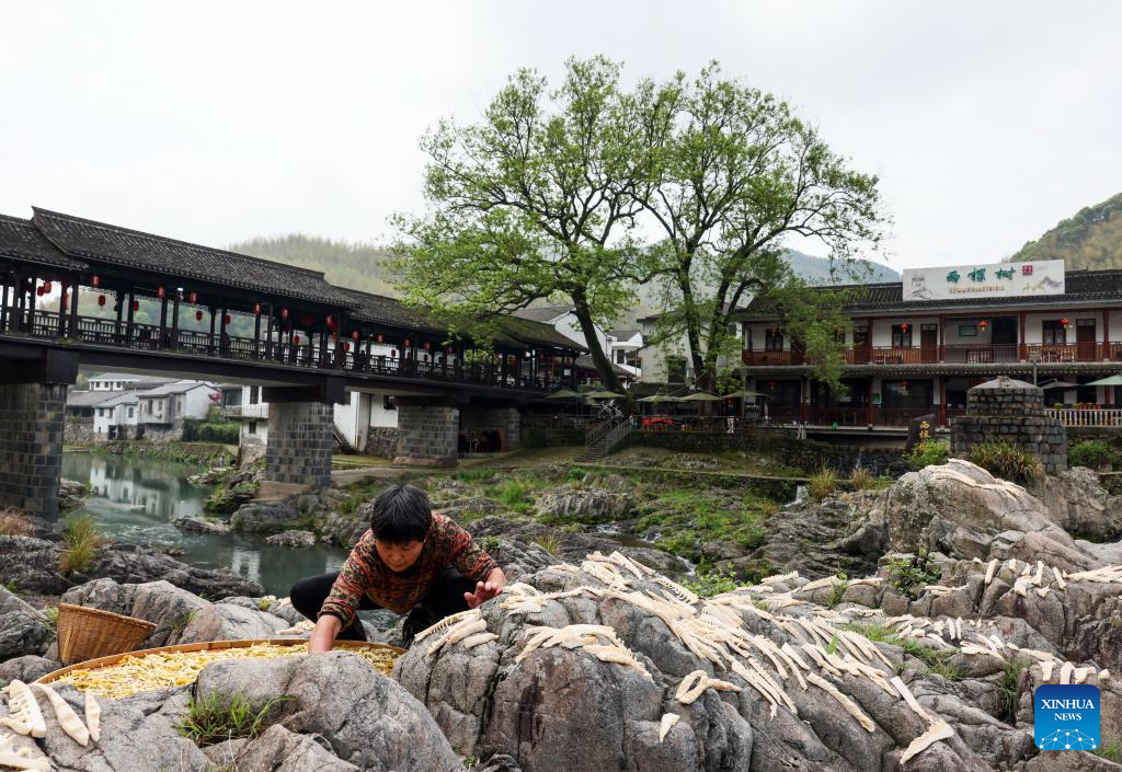 A local resident airs bamboo shoots at Zhongcun Village of Luting Township, Yuyao City, east China's Zhejiang Province, April 13, 2024. (Xinhua/Lan Hongguang)