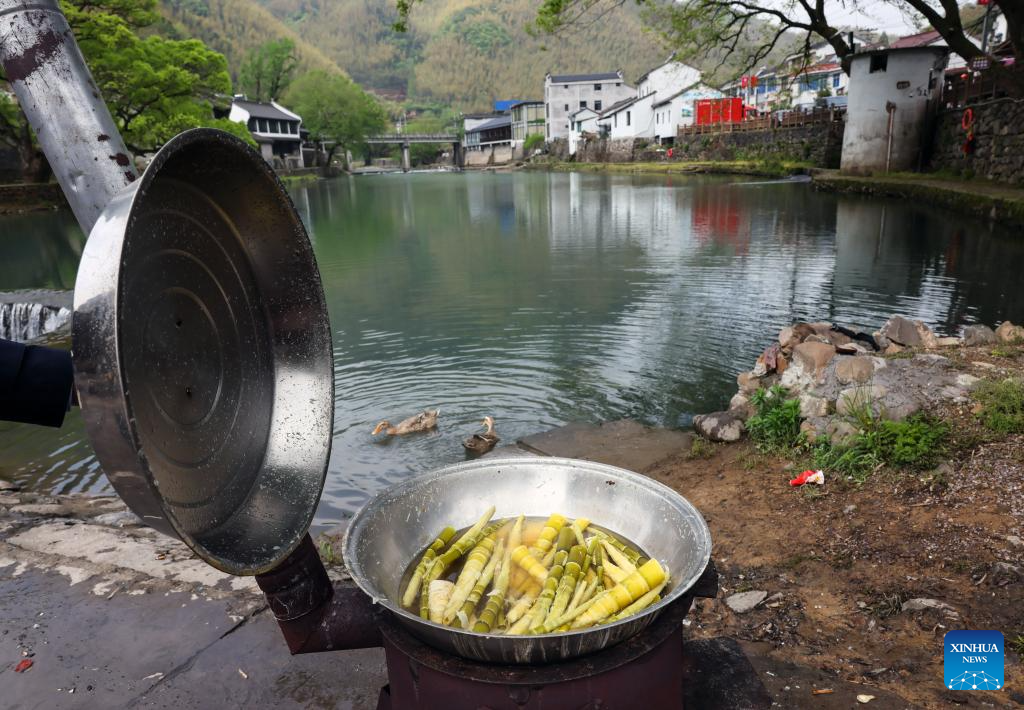 Fresh bamboo shoots are boiled before they are aired at Zhongcun Village of Luting Township, Yuyao City, east China's Zhejiang Province, April 13, 2024. (Xinhua/Lan Hongguang)
