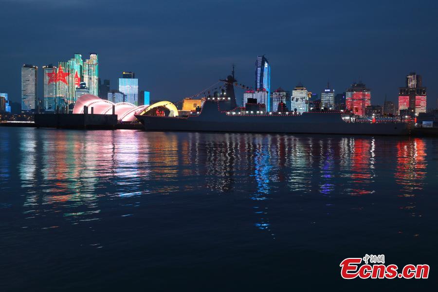 Qingdao illuminated in celebration of 75th founding anniversary of Chinese PLA navy