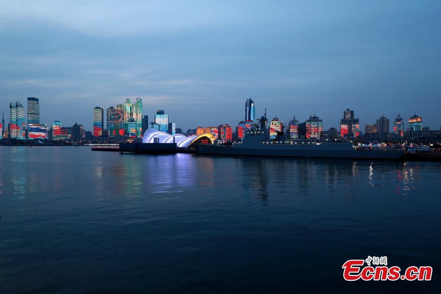 Night view of the guided-missile destroyer Kaifeng of the People's Liberation Army (PLA) navy at the Qingdao International Sailing Center pier in east China's Shandong Province, April 22, 2024. (Photo: China News Service/Fu Tian)