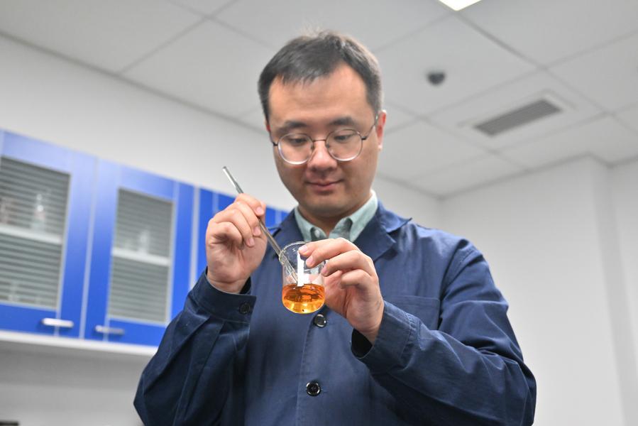 Gao Xuemiao prepares agent for experiment at the laboratory of Tianjin Library in north China's Tianjin Municipality, April 18, 2024. (Xinhua/Sun Fanyue)