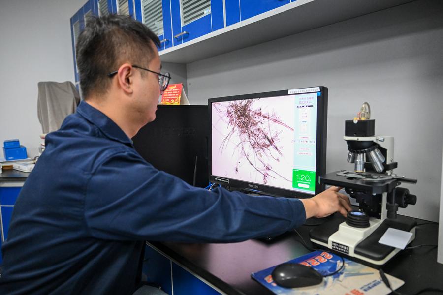 Gao Xuemiao measures the value of paper fibers at the laboratory of Tianjin Library in north China's Tianjin Municipality, April 18, 2024. (Xinhua/Sun Fanyue)