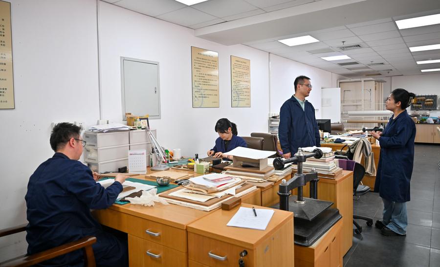 This photo taken on April 22, 2024 shows a view of the ancient book restoration department at Tianjin Library in north China's Tianjin Municipality. (Xinhua/Sun Fanyue)