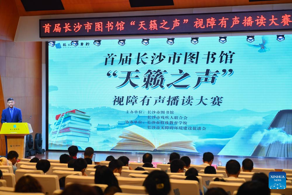 This photo taken on April 23, 2024 shows a view of the audio reading competition for visually impaired people at Changsha Library in Changsha, central China's Hunan province. In recent years, Changsha Library has created an accessible reading environment for the visually impaired. The specially designed reading room has more than 10,000 volumes of braille books and journals, over 1,000 audio books and more than 300 accessible movies. Additionally, the library has equipped with reading devices for the visually impaired, such as screen reading software, braille printers and visual aids. The library has also organized cultural activities to bring the joy of reading to the visually impaired group. (Xinhua/Chen Zeguo)