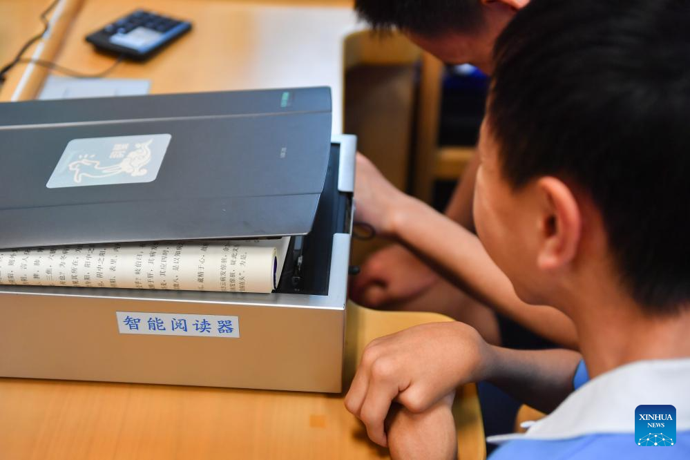 Visually impaired students listen to a book with a smart voice reader at Changsha Library in Changsha, central China's Hunan province, April 23, 2024. In recent years, Changsha Library has created an accessible reading environment for the visually impaired. The specially designed reading room has more than 10,000 volumes of braille books and journals, over 1,000 audio books and more than 300 accessible movies. Additionally, the library has equipped with reading devices for the visually impaired, such as screen reading software, braille printers and visual aids. The library has also organized cultural activities to bring the joy of reading to the visually impaired group. (Xinhua/Chen Zeguo)