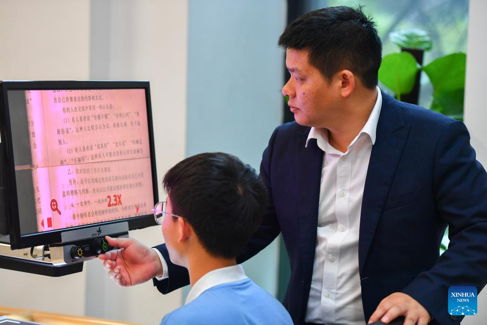 Yao Shenglong (R), a staff member of Changsha Library, assists a visually impaired student to adjust the visual assistive device at Changsha Library in Changsha, central China's Hunan province, April 23, 2024. In recent years, Changsha Library has created an accessible reading environment for the visually impaired. The specially designed reading room has more than 10,000 volumes of braille books and journals, over 1,000 audio books and more than 300 accessible movies. Additionally, the library has equipped with reading devices for the visually impaired, such as screen reading software, braille printers and visual aids. The library has also organized cultural activities to bring the joy of reading to the visually impaired group. (Xinhua/Chen Zeguo)